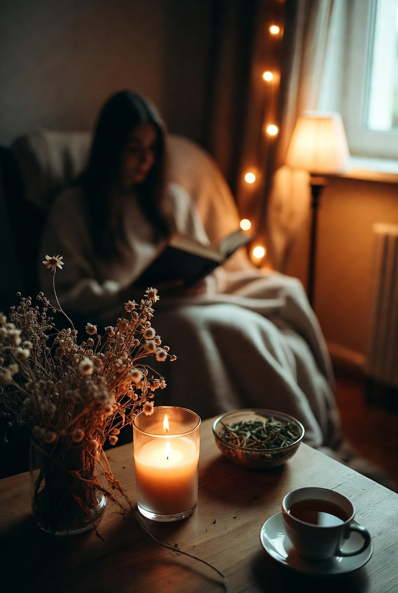 Malam hari adalah waktu aroma menjadi bintang utama. Nyalakan lilin kecil beraroma vanila manis atau lavender lembut di meja samping sofa — cahaya redup ditambah aroma yang pelan-pelan menyebar menciptakan suasana seperti berada di ruang kecil yang penuh kehangatan. Duduk dengan selimut favorit, pegang cangkir teh chamomile atau susu hangat dengan sedikit kayu manis — nikmati bagaimana aroma itu membungkus ruangan dan membuat malam terasa lebih santai dan menyenangkan.